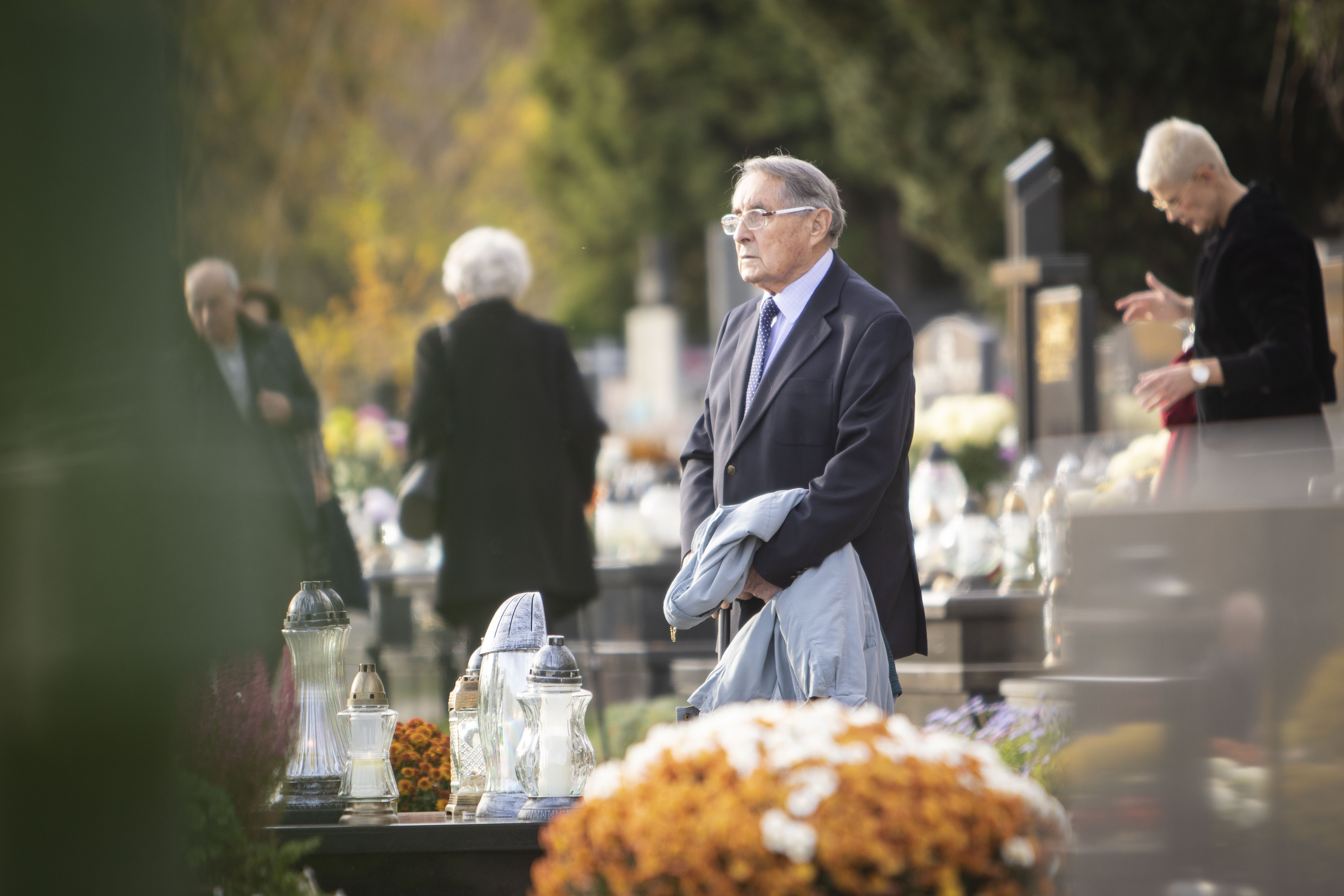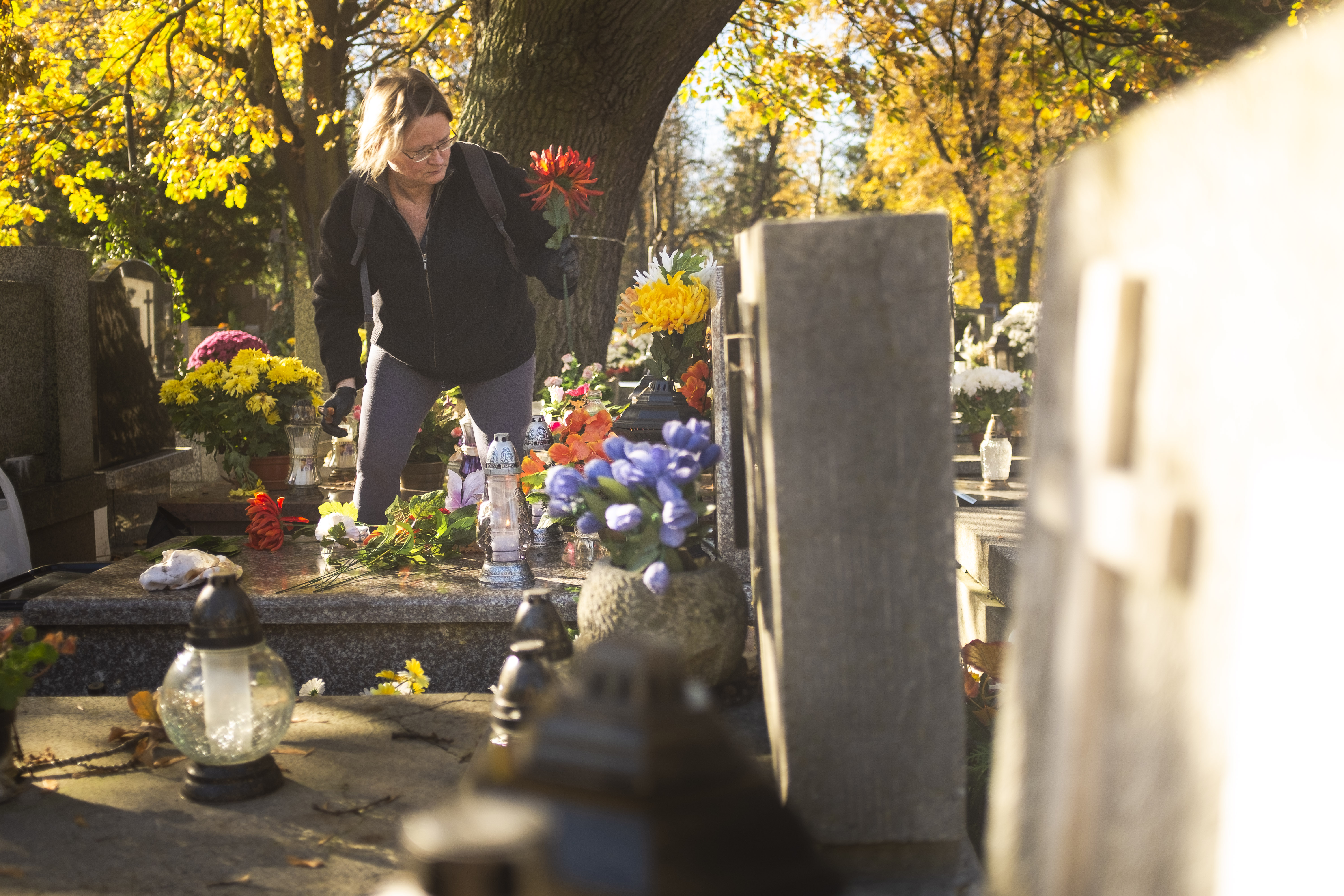In Kraków’s Rakowicki Cemetery, a woman prepares a grave for All Saints Day with candles and cut flowers.