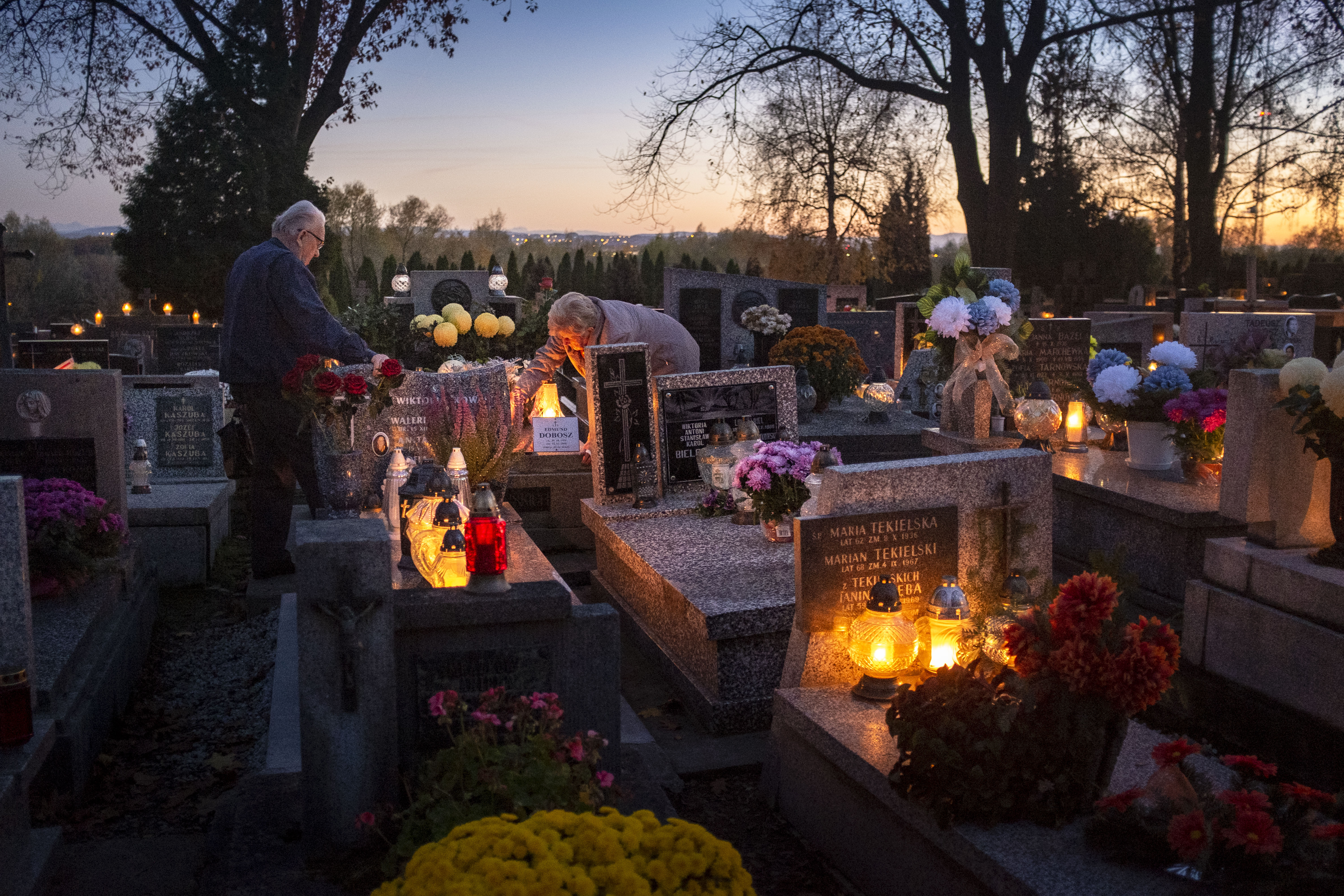 The glow of candles matches the color of the sunset in Salwator Cemetery situated on a hilltop above Kraków, Poland, on the evening before All Saints Day. Families often visit graves of many loved ones over several days around the holiday.