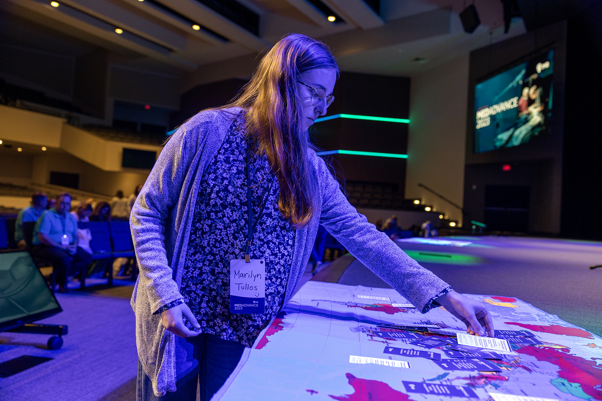 - Marilyn Tullos joins other participants in placing a commitment card on a world map on the Brentwood Baptist Church stage during the time of prayer and commitment at MedAdvance 2023. IMB Photo