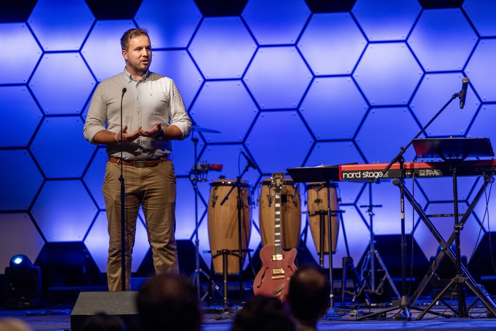 Drew Hawthorne, newly appointed IMB missionary, shares a brief testimony at the Sending Celebration, Sept. 24, at Ironbridge Baptist Church in Chester, Virginia. Hawthorne, sent by Cherokee Creek Baptist Church in Gaffney, South Carolina, will be returning to Peru where he first served as a Journeyman. IMB Photo