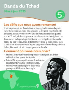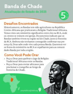 Historically, the Banda have been farmers in the Central African Republic who practiced African Traditional Religion. We’ve seen significant ministry among them in the CAR, where believers gather in churches. Documents indicated that Banda also live in southern Chad along the border of the CAR. Although we’ve been unable to confirm their presence there, God knows where every Banda person lives. We desire to see the ministry fruit in the CAR spread to Banda communities across the region.