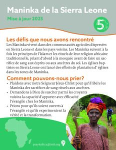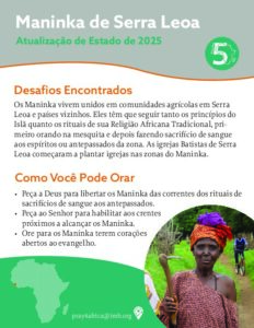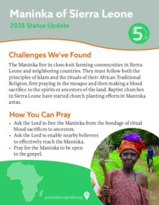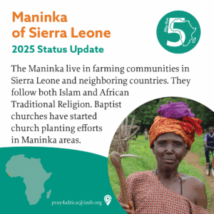 The Maninka live in close-knit farming communities in Sierra Leone and neighboring countries. They must follow both the principles of Islam and the rituals of their African Traditional Religion, first praying in the mosque and then making a blood sacrifice to the spirits or ancestors of the land. Baptist churches in Sierra Leone have started church planting efforts in Maninka areas.