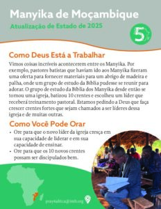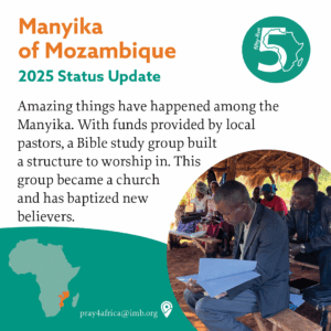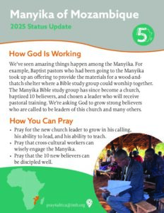 We’ve seen amazing things happen among the Manyika. For example, Baptist pastors who had been going to the Manyika took up an offering to provide the materials for a wood-and- thatch shelter where a Bible study group could worship together. The Manyika Bible study group has since become a church, baptized 10 believers, and chosen a leader who will receive pastoral training. We’re asking God to grow strong believers who are called to be leaders of this church and many others.