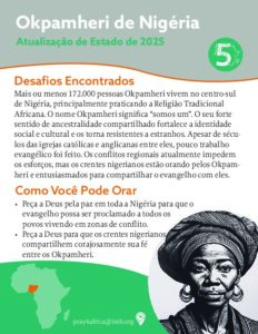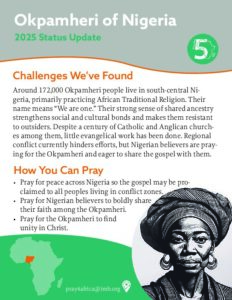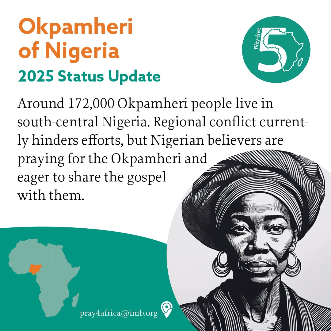 Around 172,000 Okpamheri people live in south-central Nigeria, primarily practicing African Traditional Religion. Their name means “We are one.” Their strong sense of shared ancestry strengthens social and cultural bonds and makes them resistant to outsiders. Despite a century of Catholic and Anglican churches among them, little evangelical work has been done. Regional conflict currently hinders efforts, but Nigerian believers are praying for the Okpamheri and eager to share the gospel with them.