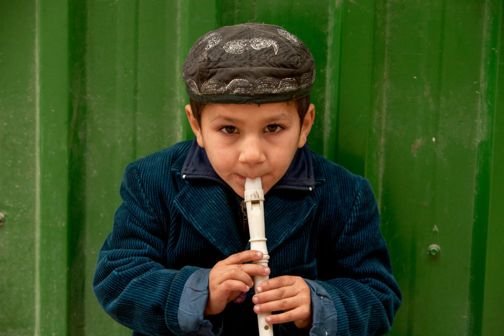 A young boy plays a recorder for money on the streets of Baku.