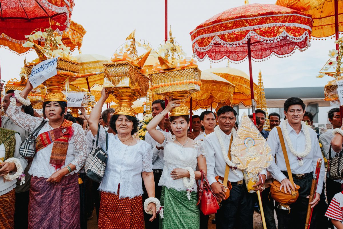 A celebration and fundraiser for a local Buddhist temple on the outskirts of Phnom Penh, Cambodia. The people dress up and offer food, flowers, and money to the temple.