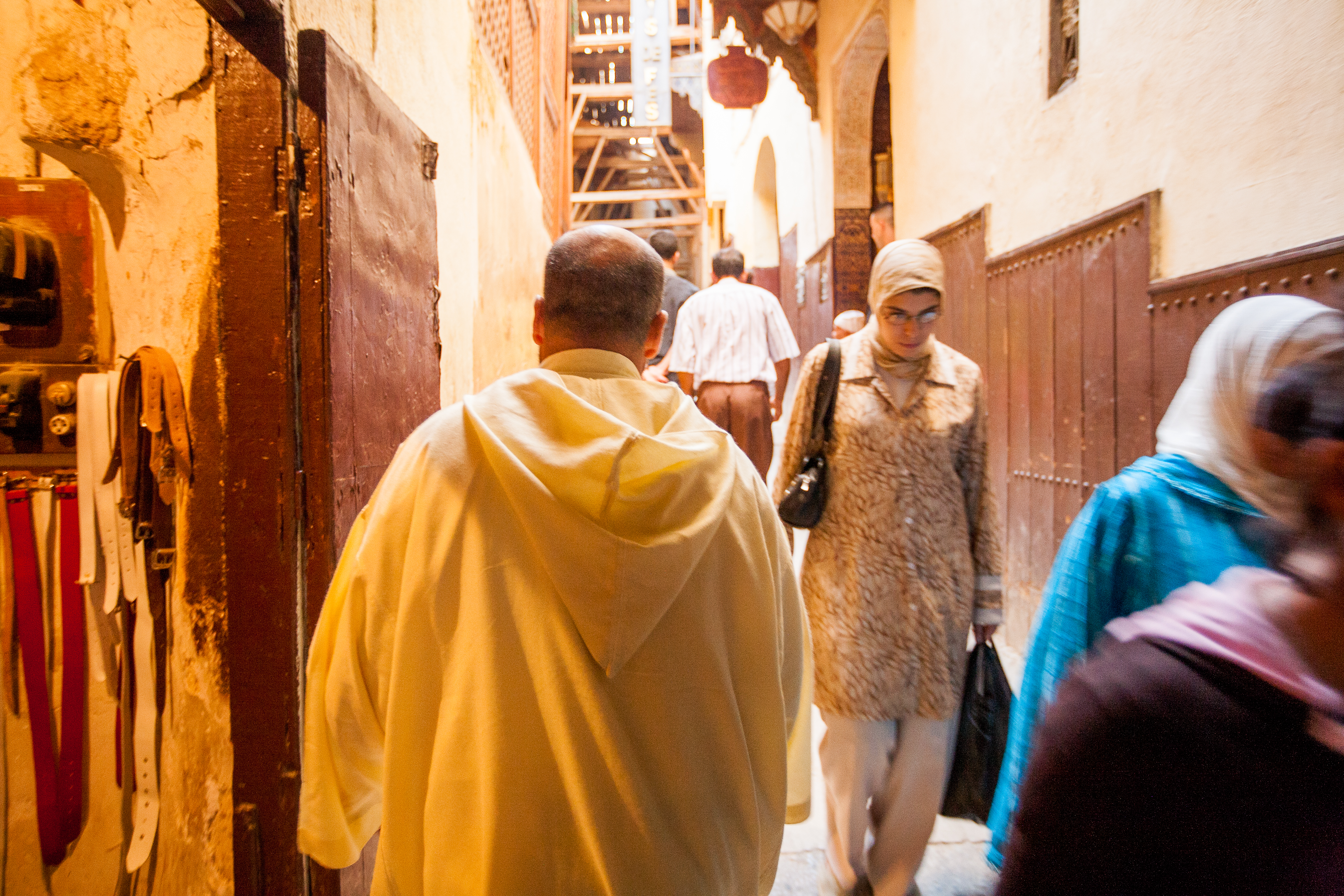 The narrow streets inside the medina of Fez. Fez is one of the best-preserved Old Cities in the Arab world. The sprawling medina is also the world’s largest car-free urban zone. The massive medina, with its high walls and winding streets, cannot be navigated without a guide or you will surely get lost.