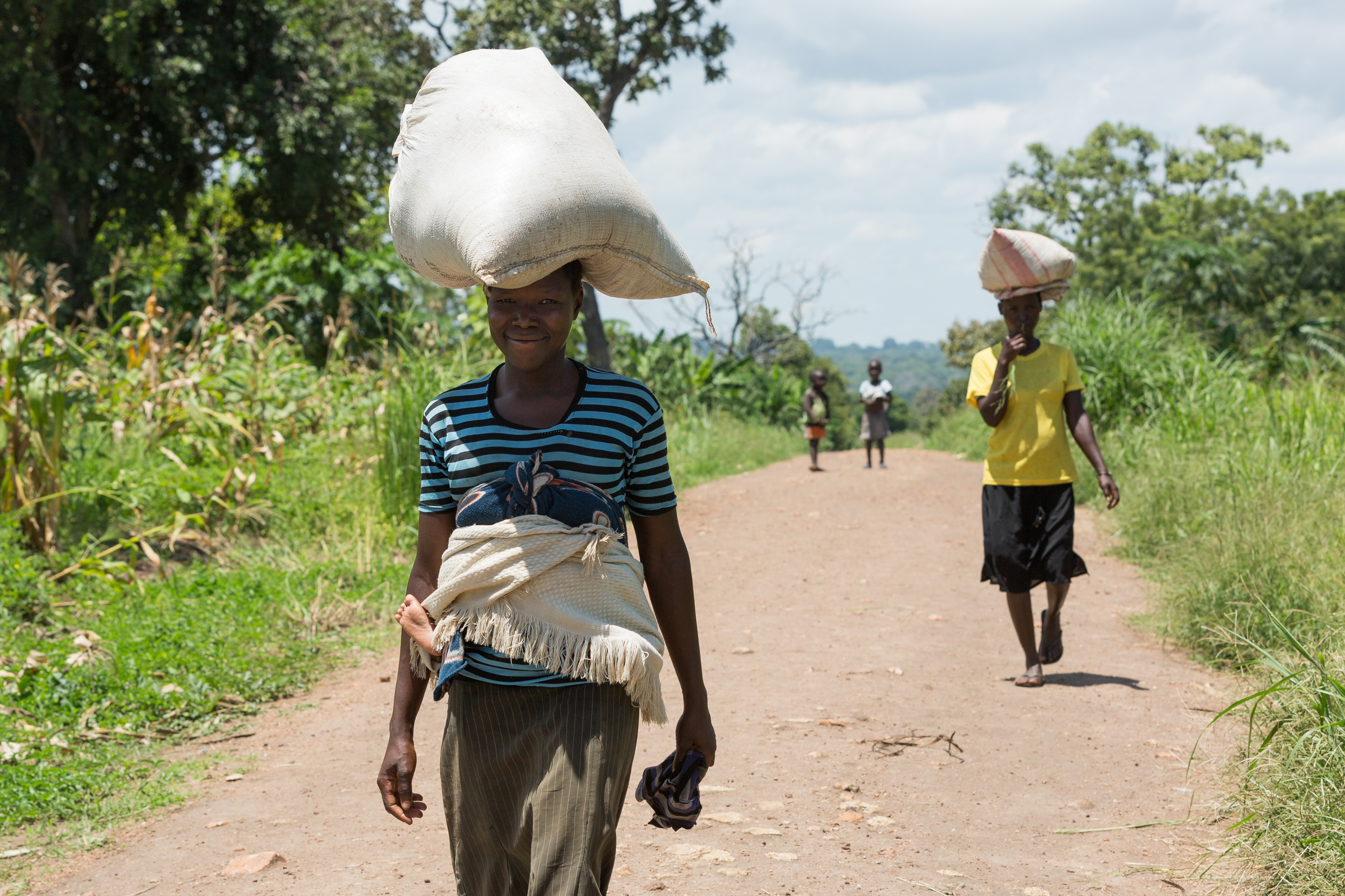 Refugees from South Sudan carry food they received from the UN Refugee Agency back to their homes in Maaji#2 Block of Adjumani Refugee Settlement in northwestern Uganda.