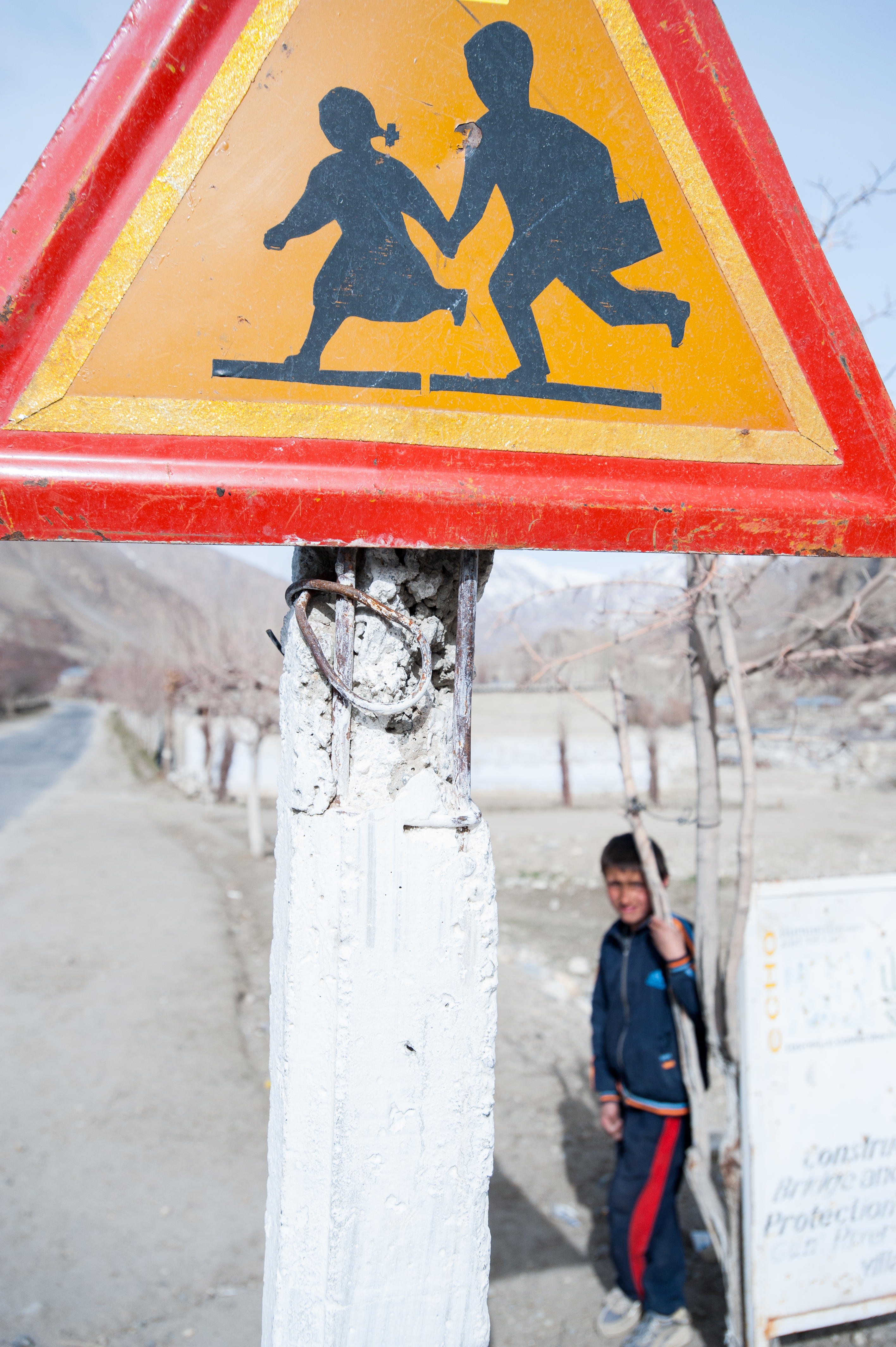 A Shughni boy stands near a “Children Playing” road sign beside a road in a village in the Gorno-Badakhshan region.
