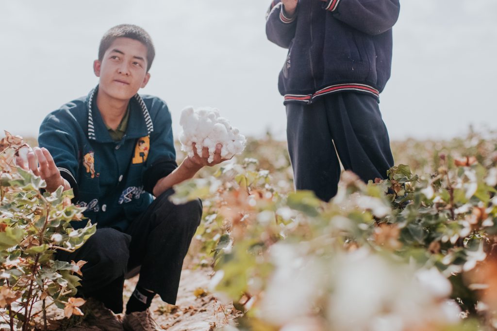 Uighur boys hold their cotton harvest outside the town of Kashgar, historically known as the “pearl of the Silk Road” trading route on the Kyrgyzstan and China border.