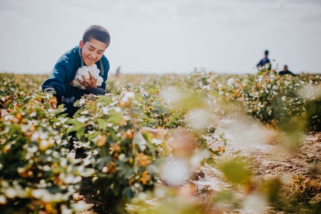 Uighur boys hold their cotton harvest outside the town of Kashgar, historically known as the “pearl of the Silk Road” trading route on the Kyrgyzstan and China border.