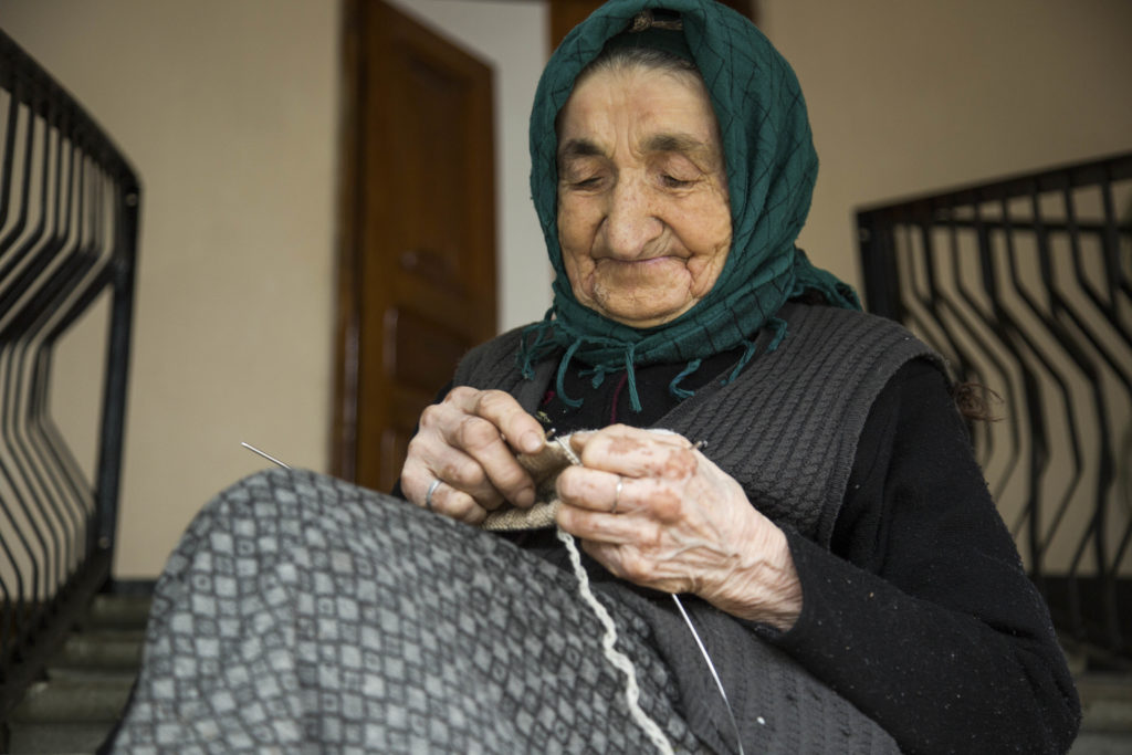 An elderly lady crochets traditional Tsakhur socks. The Tsakhur are a North Caucasus people group in northwest Azerbaijan.