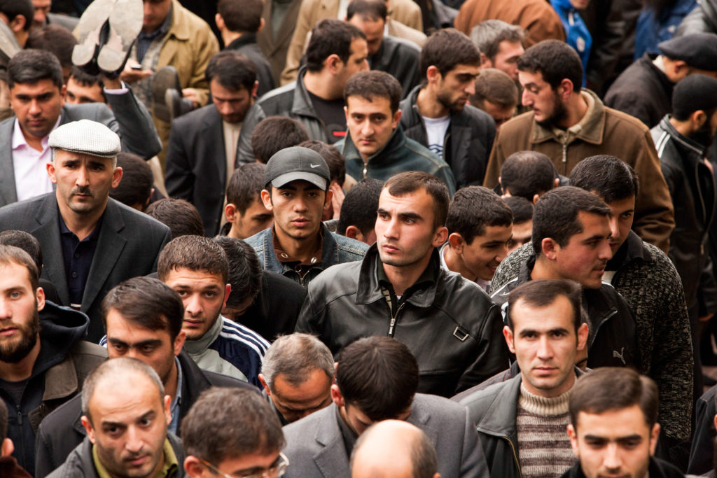 Taken during Friday prayers at a small mosque in Baku. The crowd reached well over 1,000 inside and out so people had to flood into streets to lie there prayer mats for prayer time. The crowd was all men.