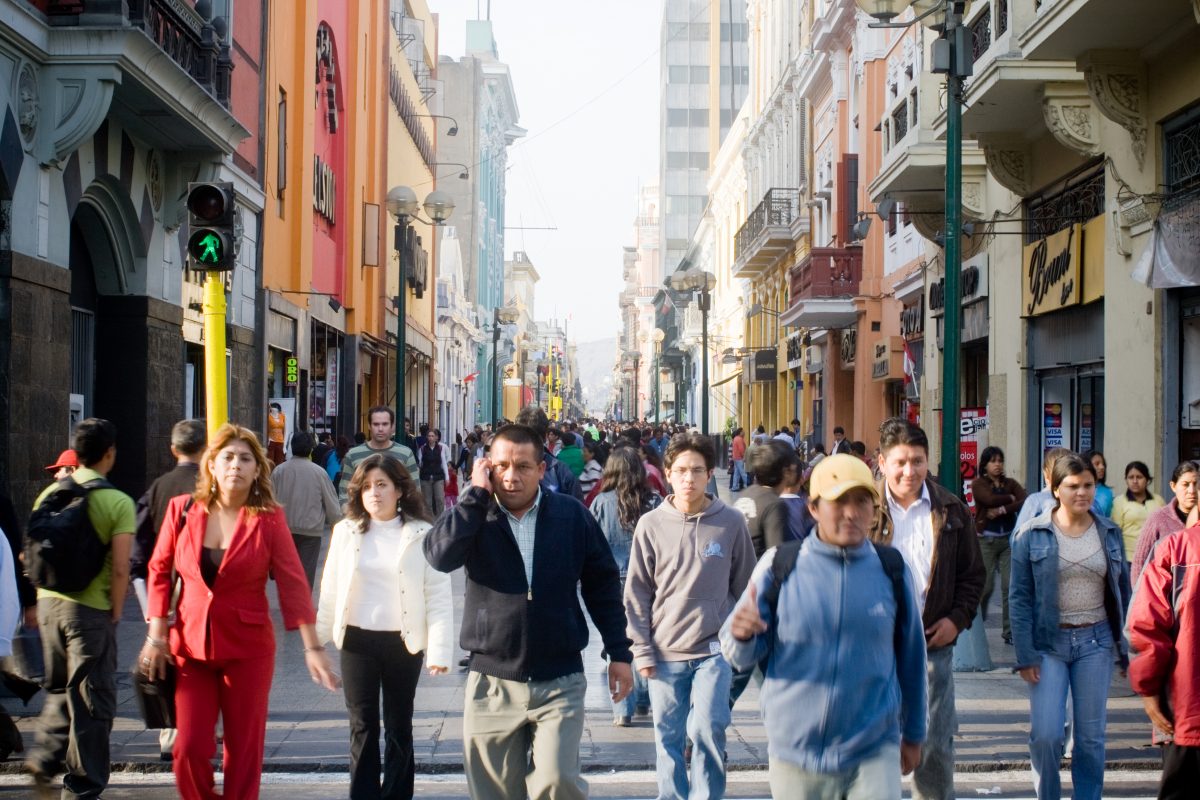Visitors and tourists walk in a downtown park in Lima, Peru.