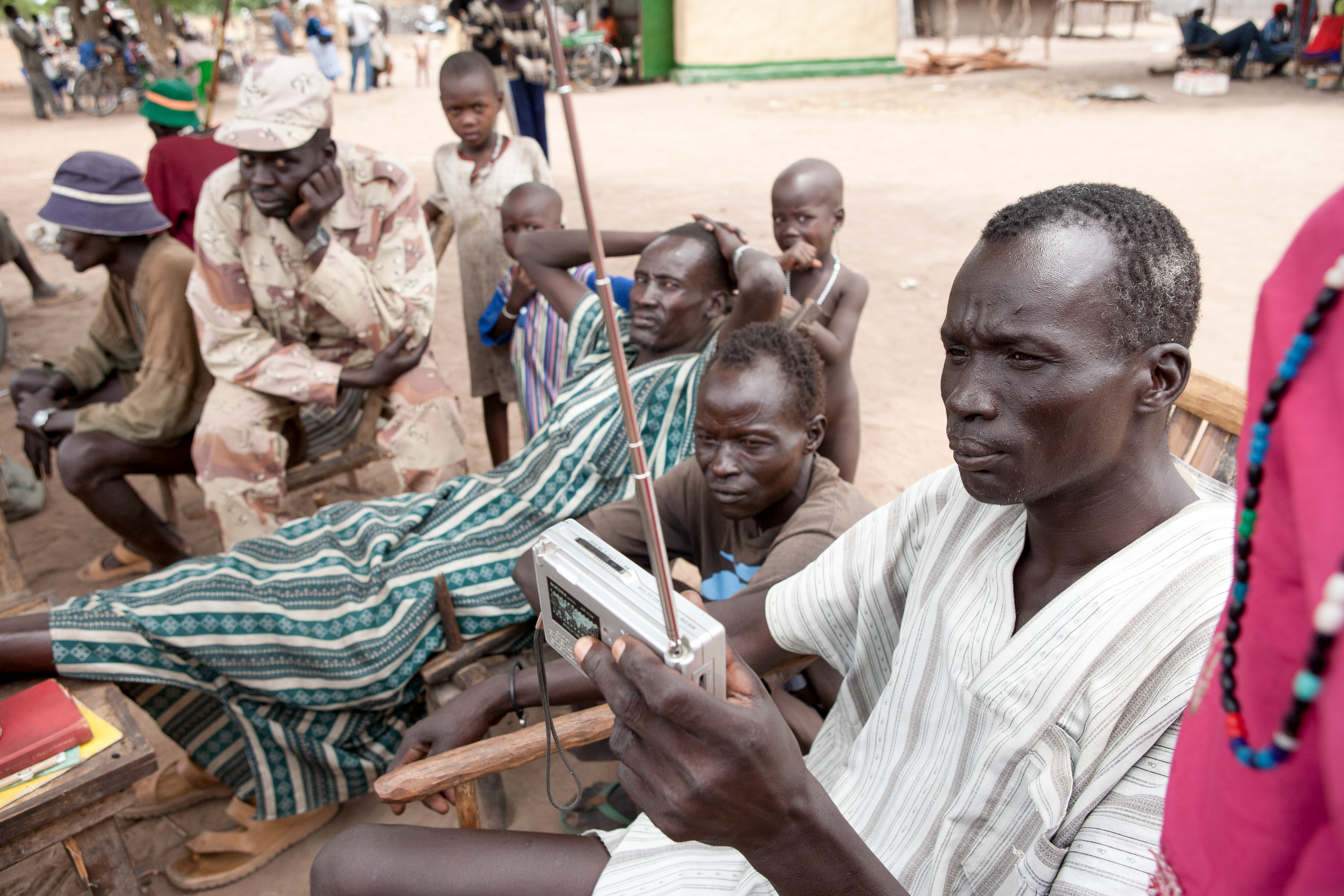 A row of Dinka Agaar men sit by the road, sell tobacco and listen to a radio.