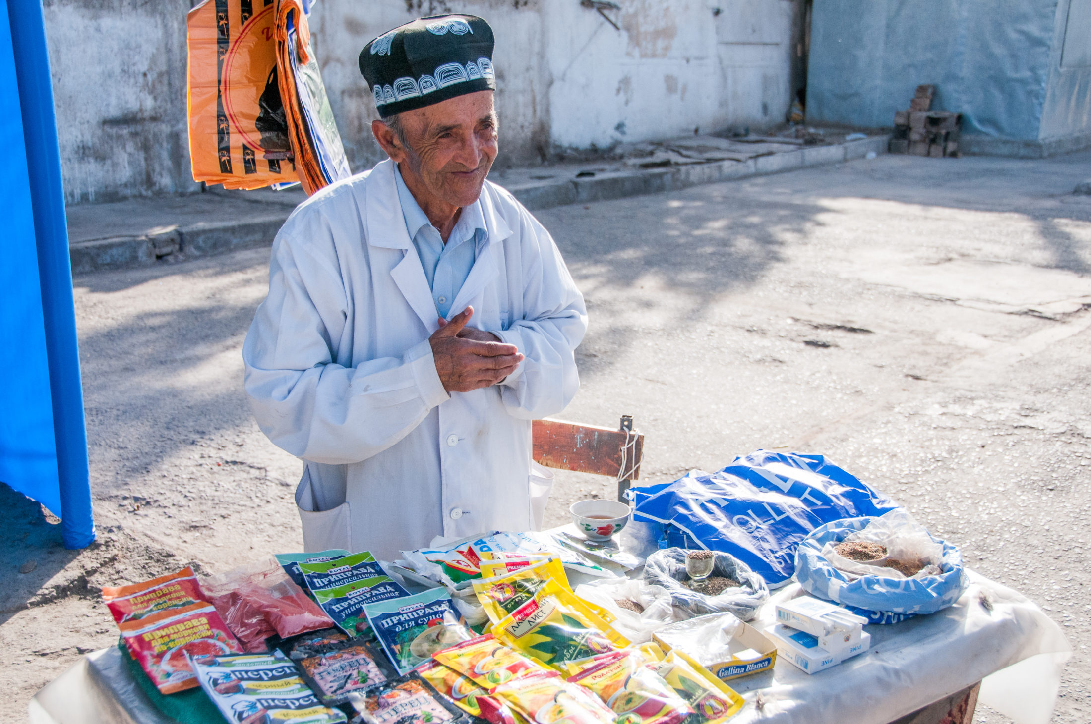 An Uzbek man at his booth in the Vada-Nasos Bazaar in Dushanbe.