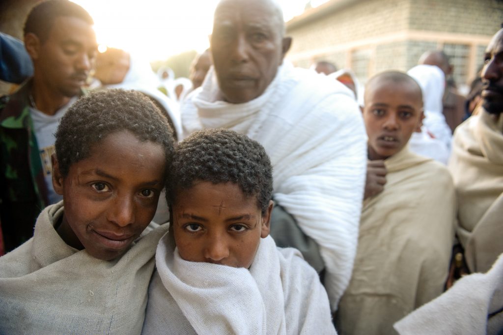 Two young boys wait to receive a blessing from an orthodox priest. The boys were among thousands of early-morning worshippers at an service honoring the virgin Mary.