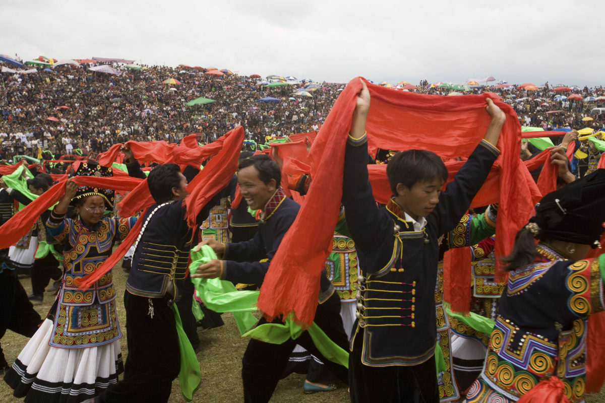 The Nosu people in southwest China celebrate the Fire Festival annually. The festival involves several thousand people gathering on a mountainside arena to watch events that include wrestling, bull fighting, horse racing, and a model competition. The festival is concluded at night by dancing around a fire to music.
