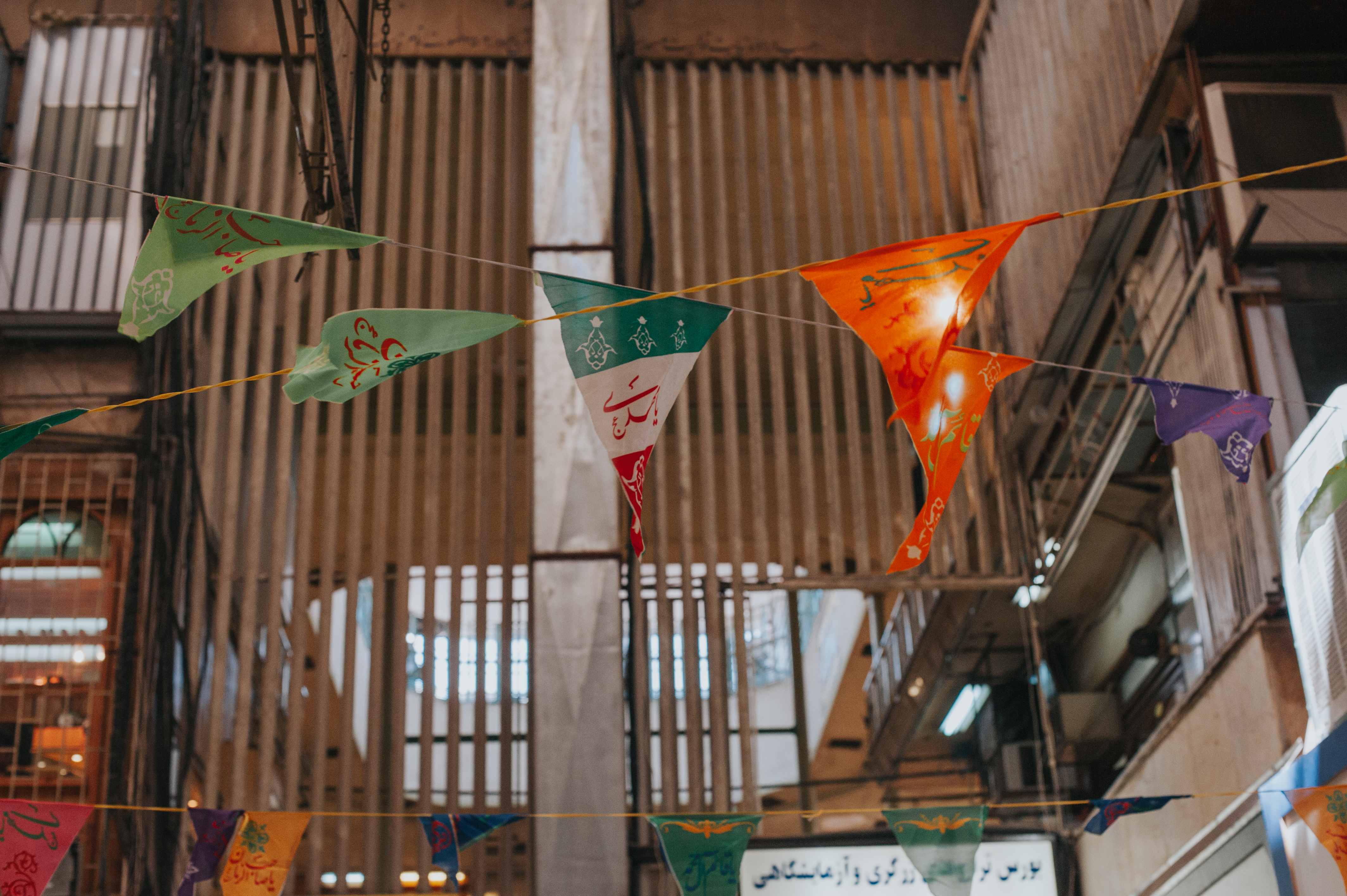 Flags hanging in the Tehran Bazaar in Tehran, Iran.