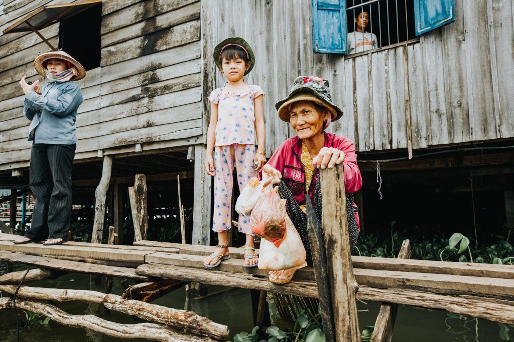 Scenes of daily life in a floating water village in Cambodia. Young and old live in the villages, ready and able to adapt to a life on the water. The older lady on the right has just made a trip to buy food and is ready to return to her houseboat with food in bags.