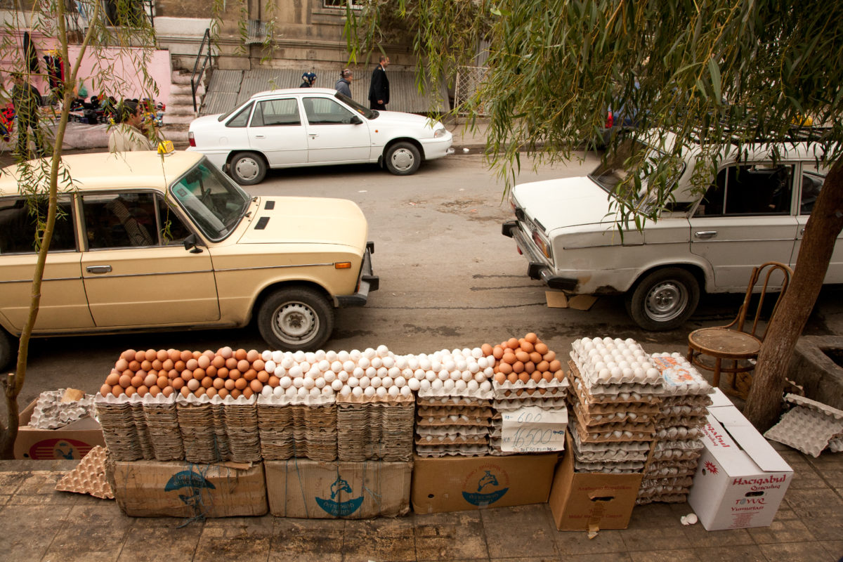 A scene from one of the main food markets in Baku. Locals use these markets instead of conventional grocery stores to buy most of their fresh food, vegetables, meat, spices, nuts, etc.