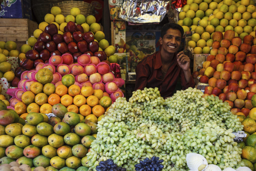 A fruit vendor in Bangalore, India, smiles for a photo.