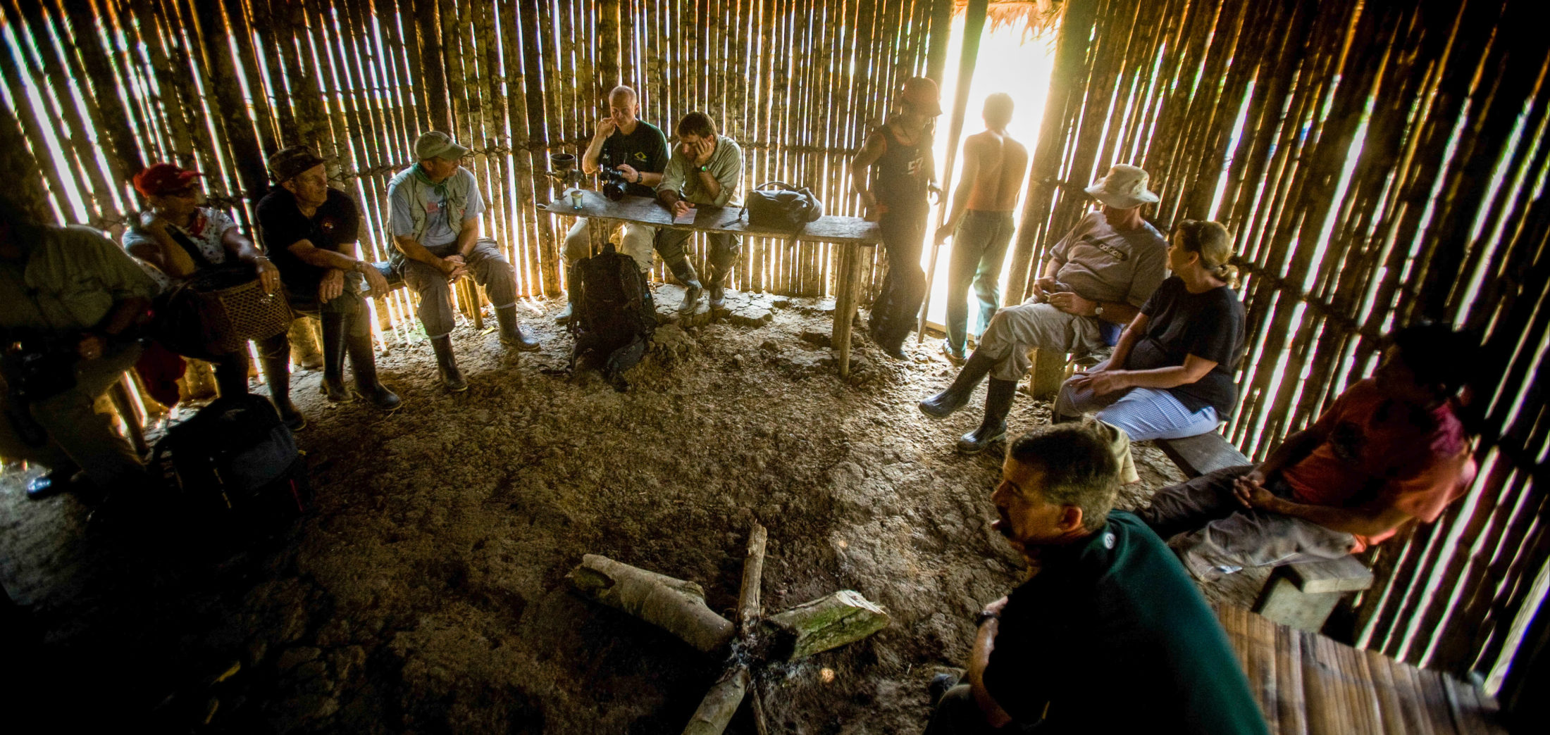 A mission group sits inside a Shuar house chatting with the family, in the Ecuadorian jungle of the Amazon basin.