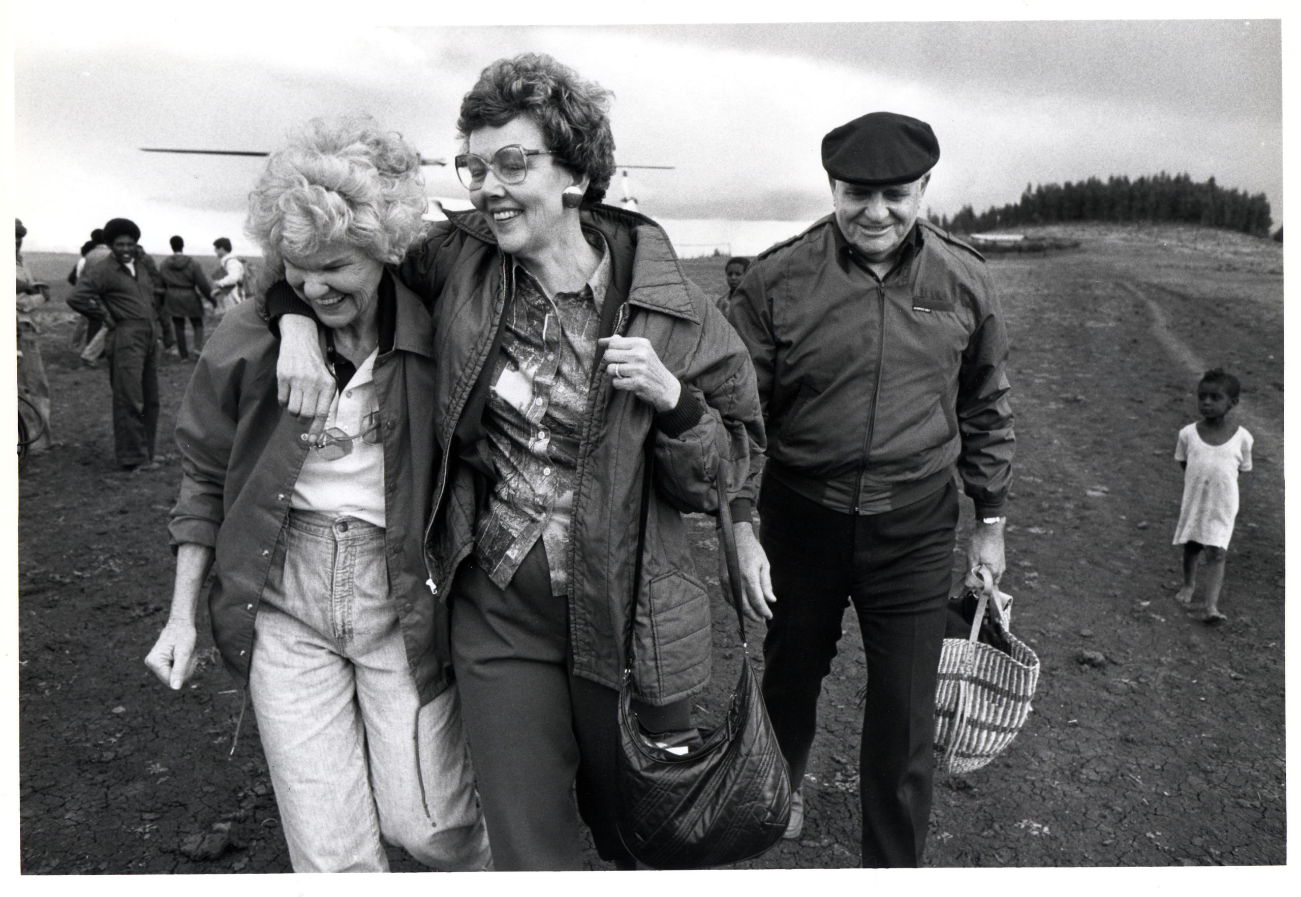 Helen Jean Parks enjoys a reunion with Mary Saunders, former missionary nurse and staff wife, after arriving with her husband, Keith, to visit one of Southern Baptists’ feeding stations in drought-stricken Ethiopia in 1986. IMB photo