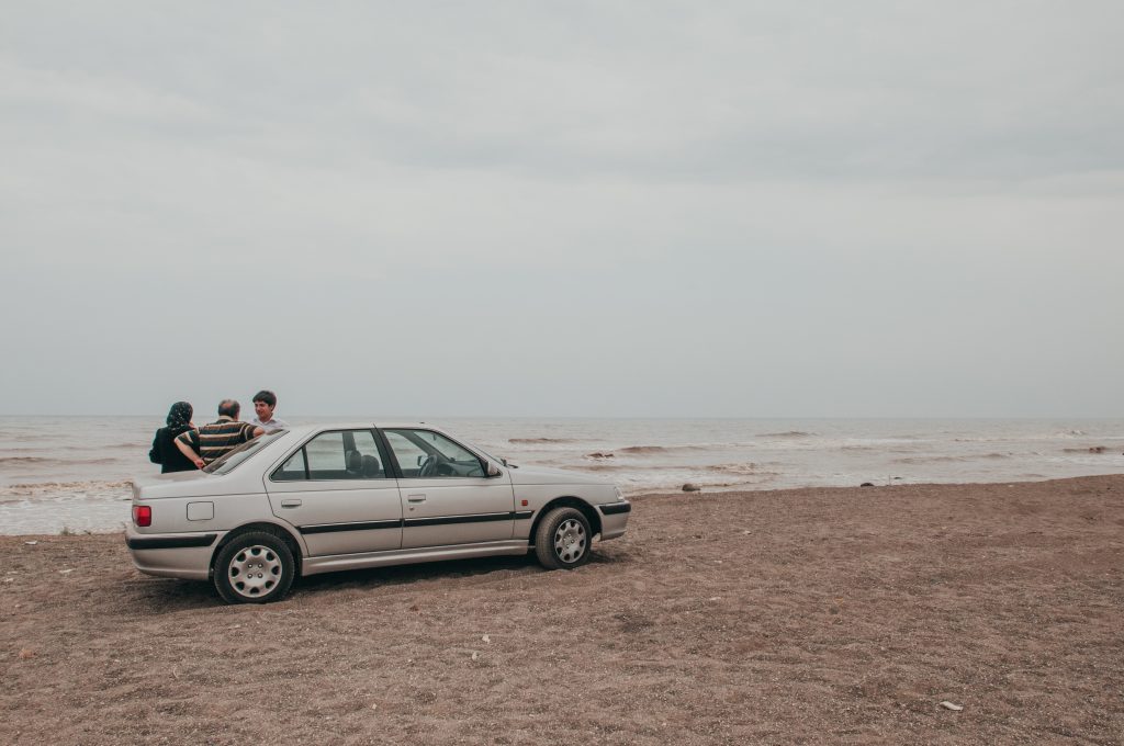 A family hangs out on a beach beside the Caspian Sea in Western Iran.