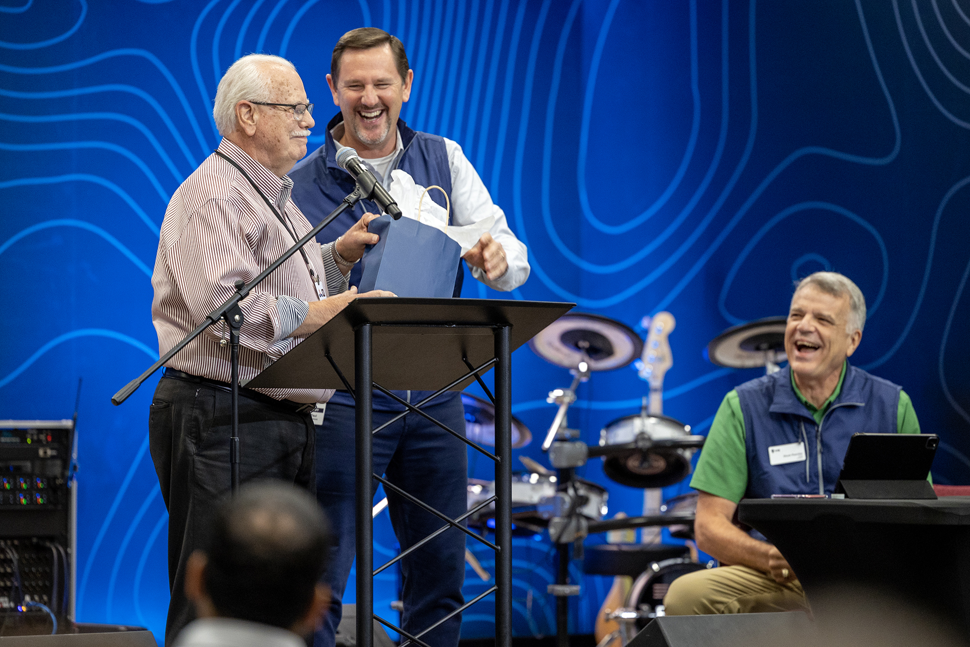 IMB President Emeritus Jerry Rankin jokingly asked for a vest that matched the one Paul Chitwood and Chuck Pourciau were wearing. Chitwood immediately presented him with a vest they intended to give him later. Rankin served the IMB for 40 years, 17 years as president. IMB Photo