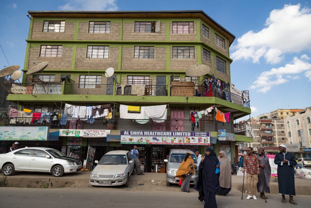 A street scene in the majority Muslim community of Pangani in Nairobi, Kenya. The neighborhood is mostly inhabited by Somalis, Ethiopians and Sudanese.