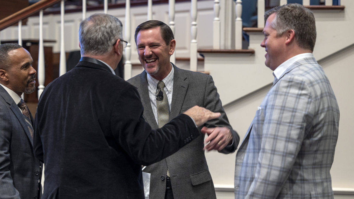 South Carolina Baptist Convention President Alex Sands (far left); IMB trustee Marshall Blalock (back to camera); Wes Church, pastor of host church, First Baptist Columbia (far right); and IMB President Paul Chitwood fellowship after the Sending Celebration. IMB Photo