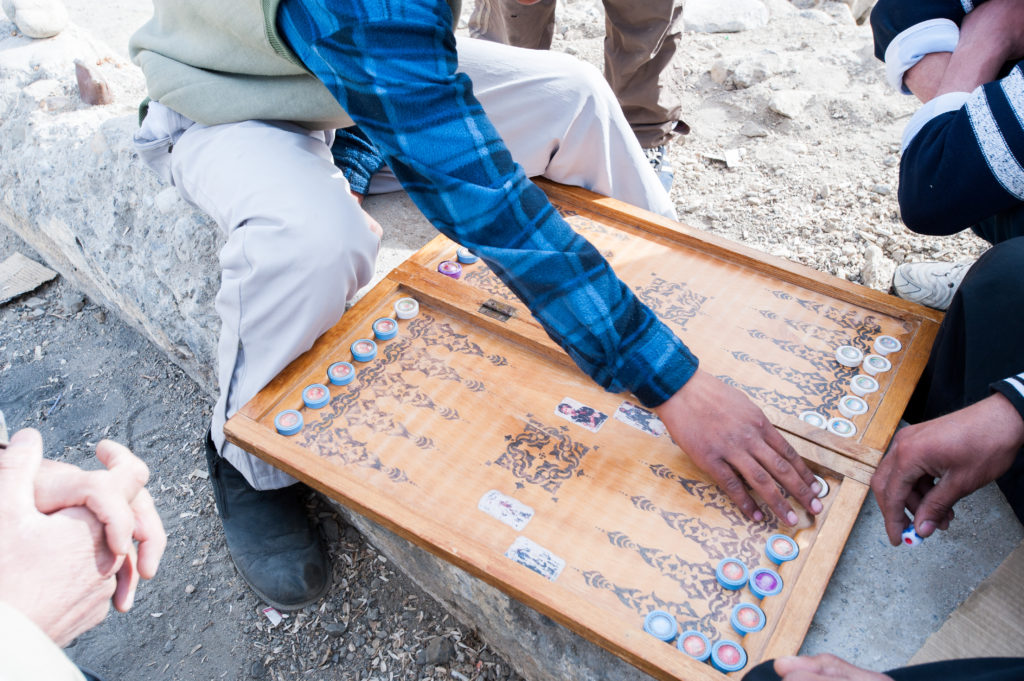 Detail of Shughni men playing a game of backgammon roadside in a village in the Gorno-Badakhshan region.