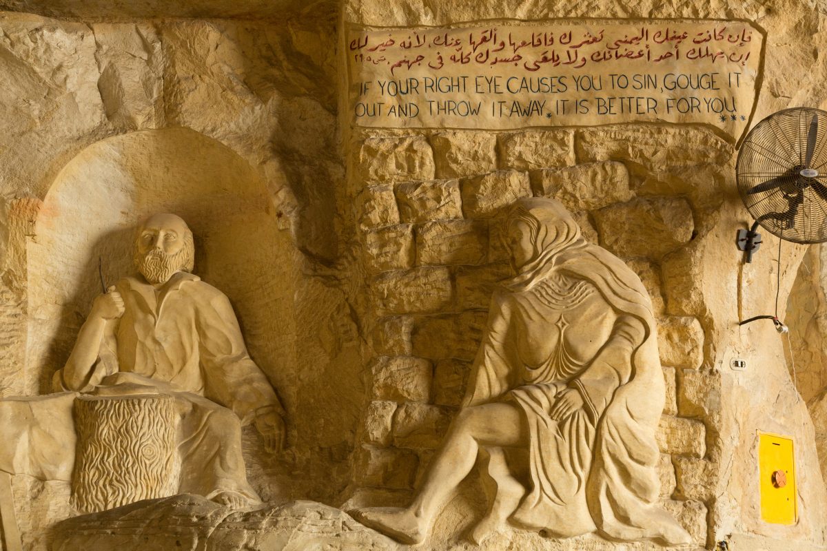 A sculpture illustrating a story about Saint Simon the Tanner on display in the Cave Church of the Zabbaleen in Cairo, Egypt. Not to be confused with Simon the Tanner in the New Testament, this man lived in 10th century Egypt and is famous for his involvement in the purported miraculous moving of Mount Mokattam. In this sculpture he is shown brandishing a needle just before gouging his eye out since the woman before him caused him to lust in his heart.