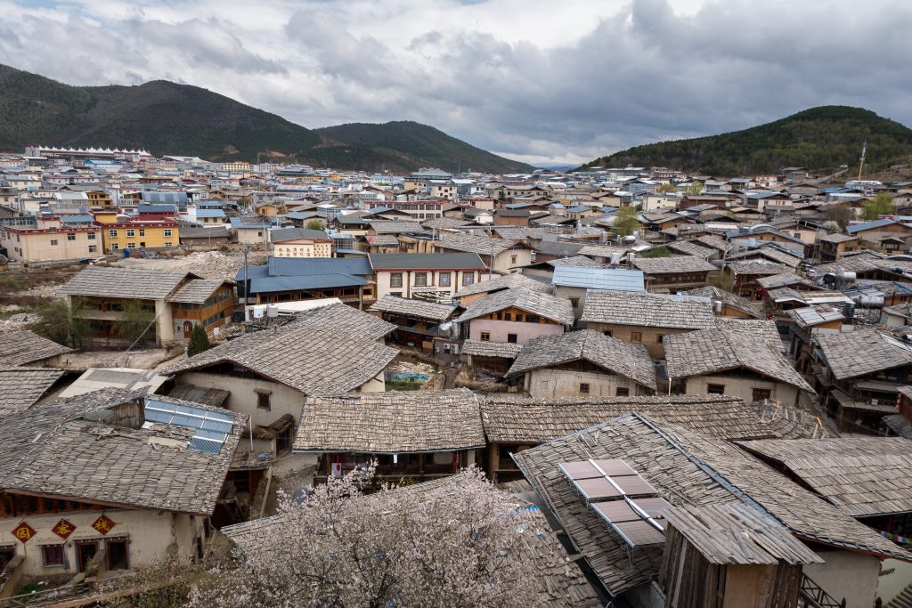 A view of Shangri-La city with distant mountain in the background.