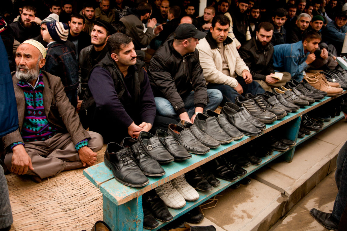 Taken during Friday prayers at a small mosque in Baku. The crowd reached well over 1,000 inside and out so people had to flood into streets to lie there prayer mats for prayer time. The crowd was all men.