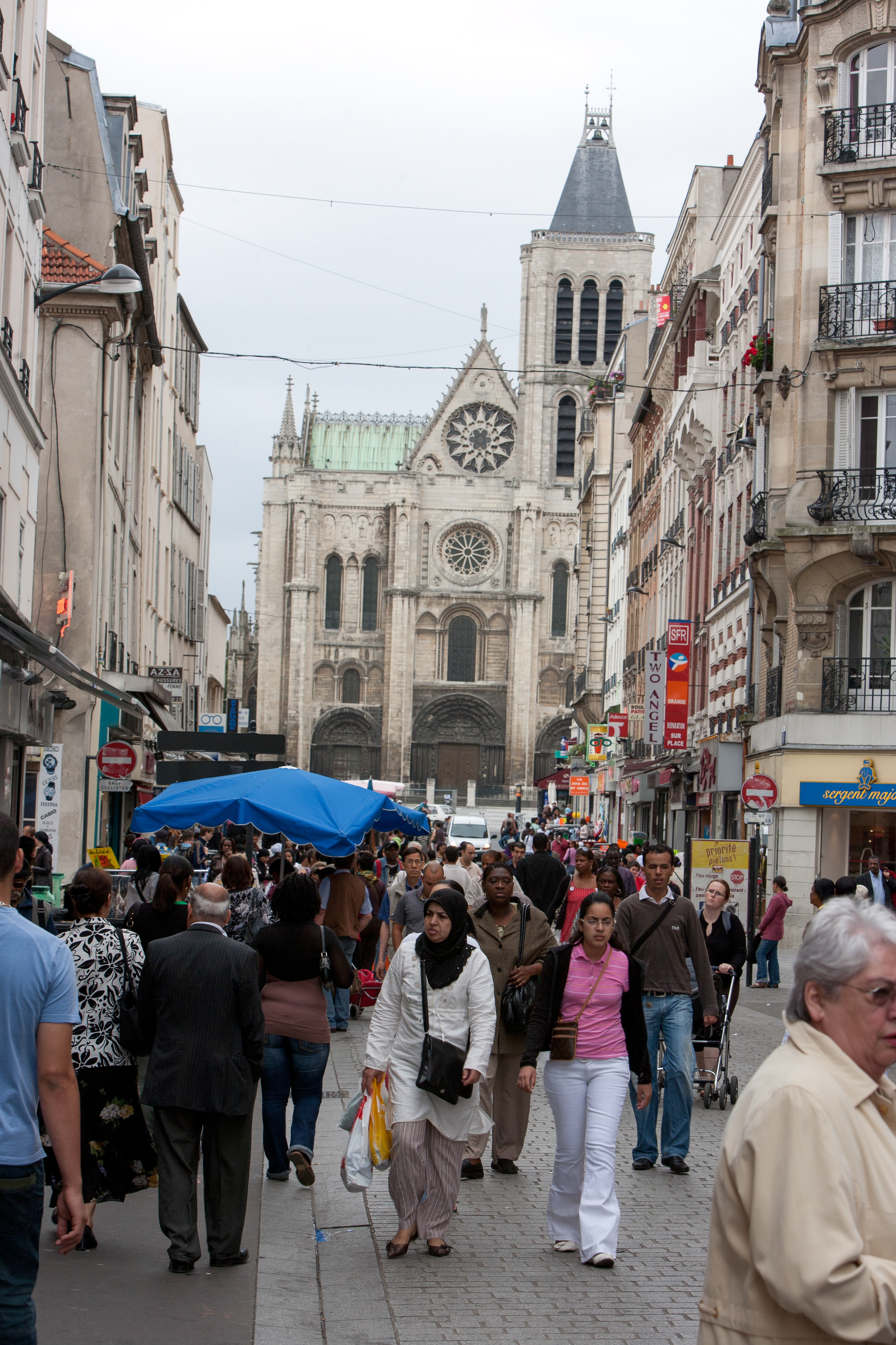 A street scene in St. Denis, a community in Paris. The Basilique St. Denis is in the background.