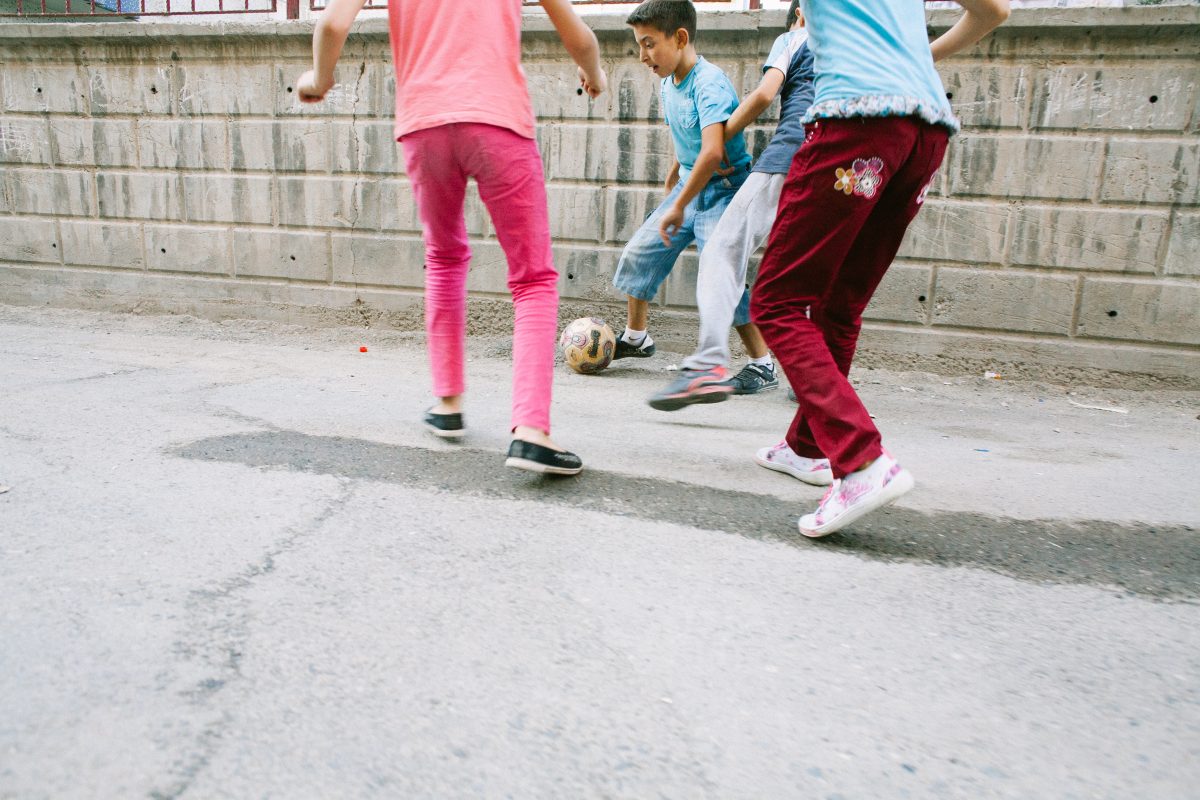 Boys and girls play a game of soccer on the street in front of their apartment complex.