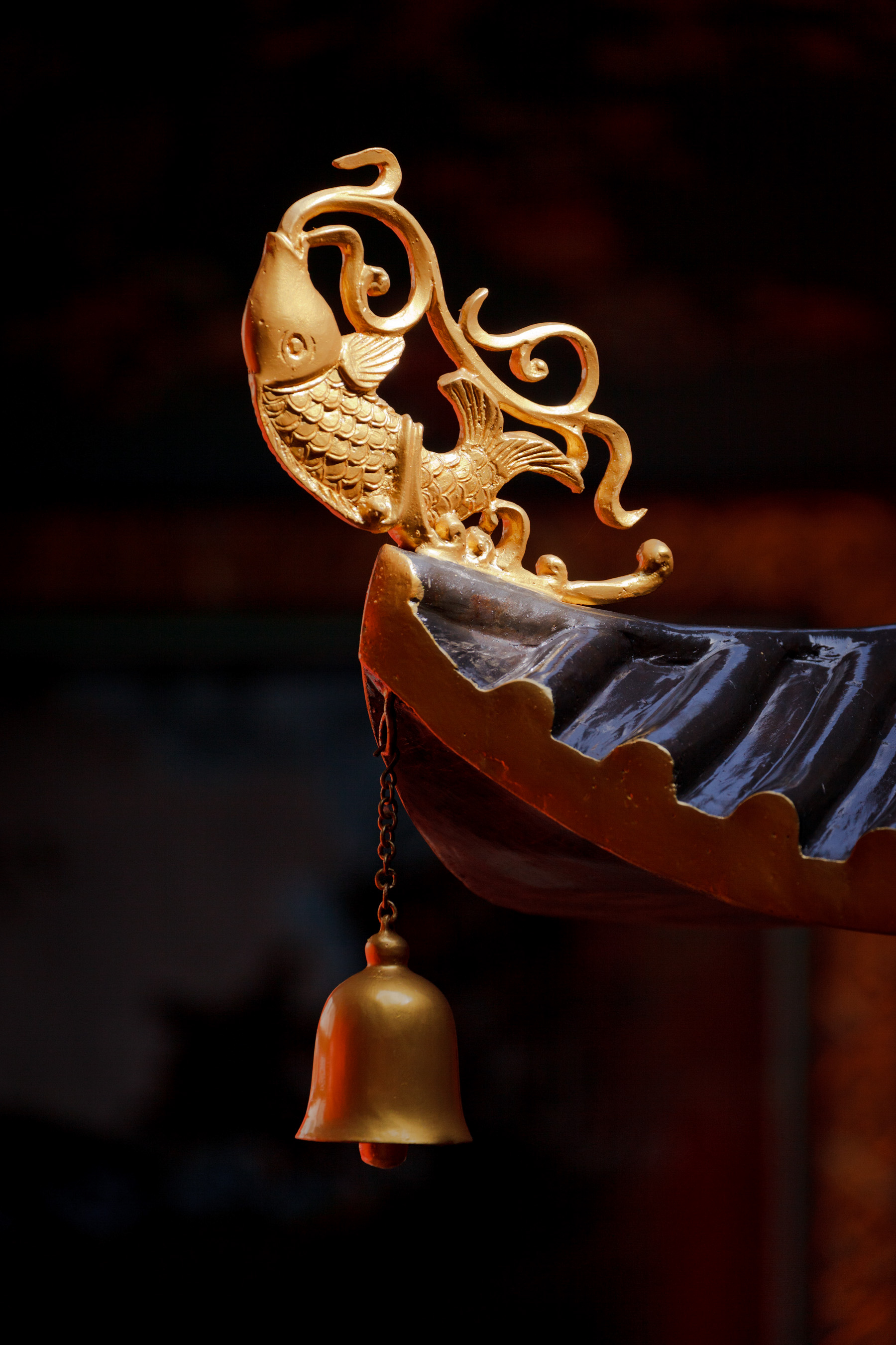 A bell hangs from the corner of a pagoda in Malaysia. Large amounts of money are spent on the architecture and details of places of worship.