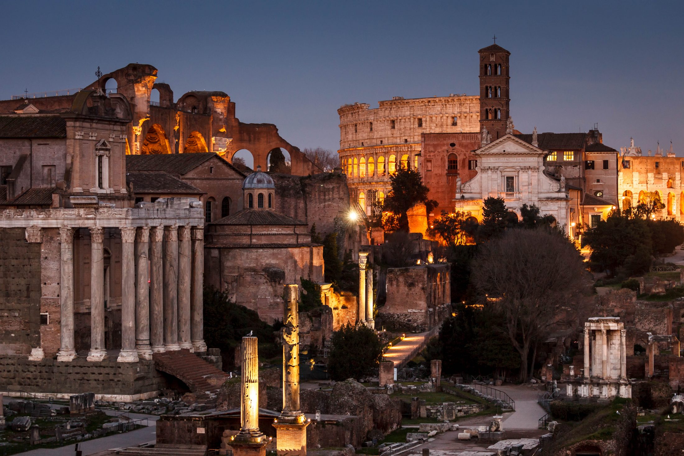 The Roman Forum seen at sunset. This is one of the oldest parts of the city, with sites such as the Temple of Saturn and the Colosseum.