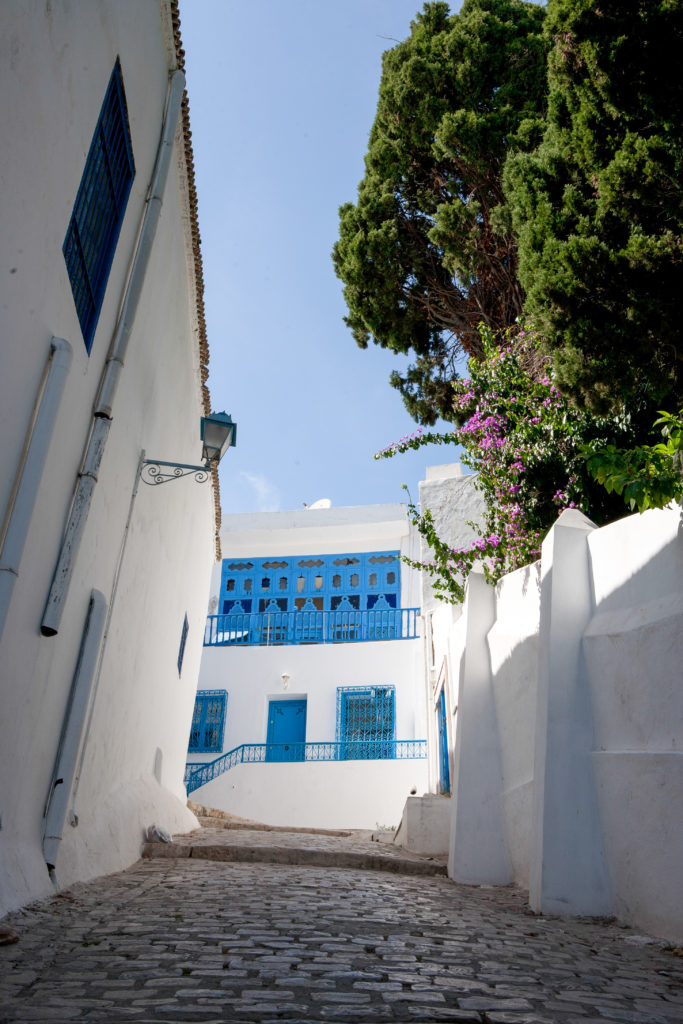 A street scene in Sidi Bou Said, in Tunis, Tunisia.