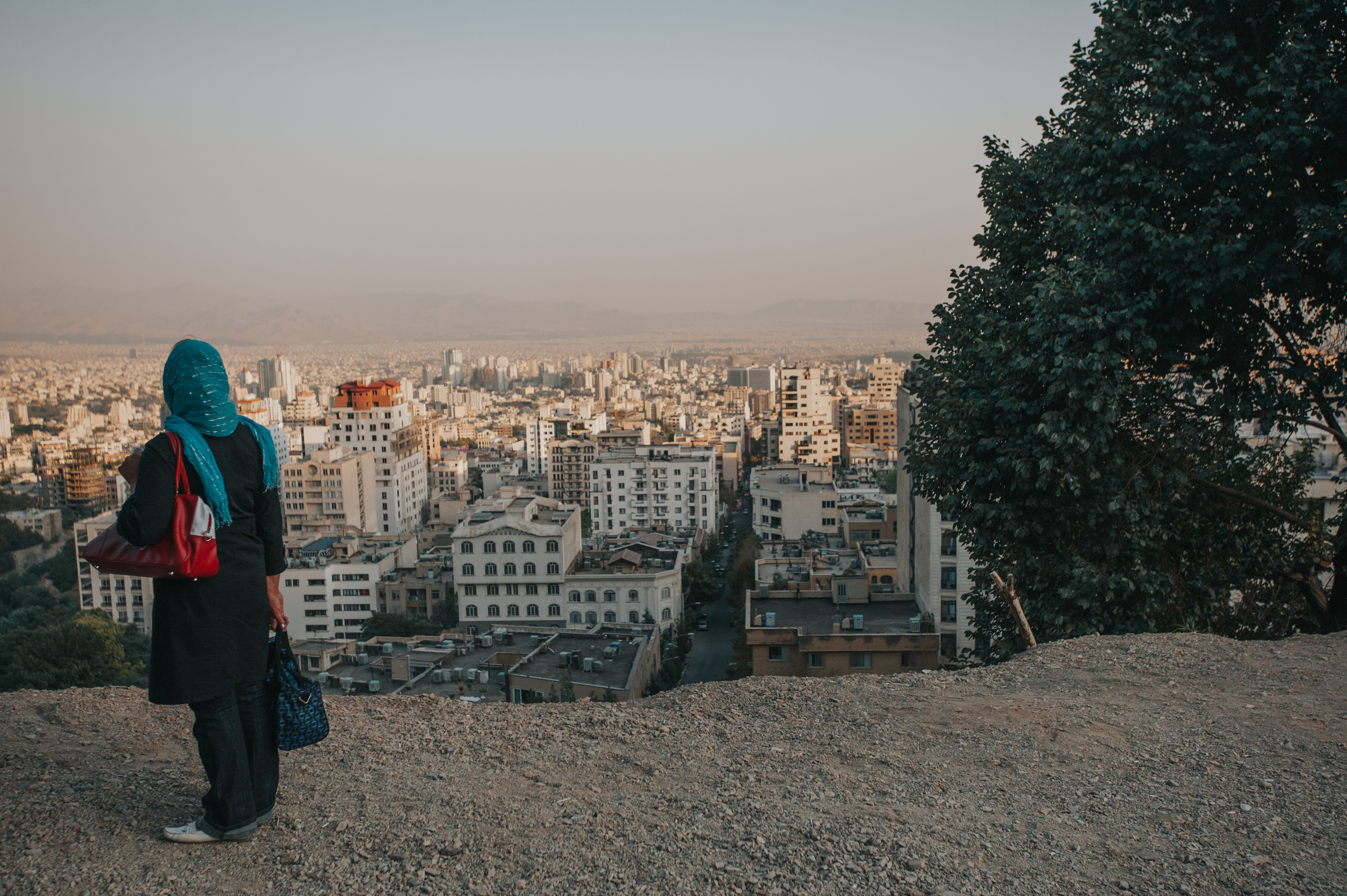 An Iranian woman stands at an overlook of Tehran, Iran. Tehran, the capital of Iran and its largest city, has a population of about 15 million people.