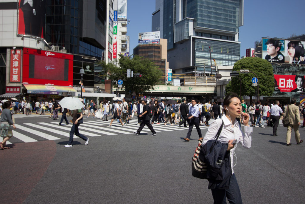 A woman crosses the street in Tokyo’s Shibuya Crossing, the busiest pedestrian crosswalk in the world.