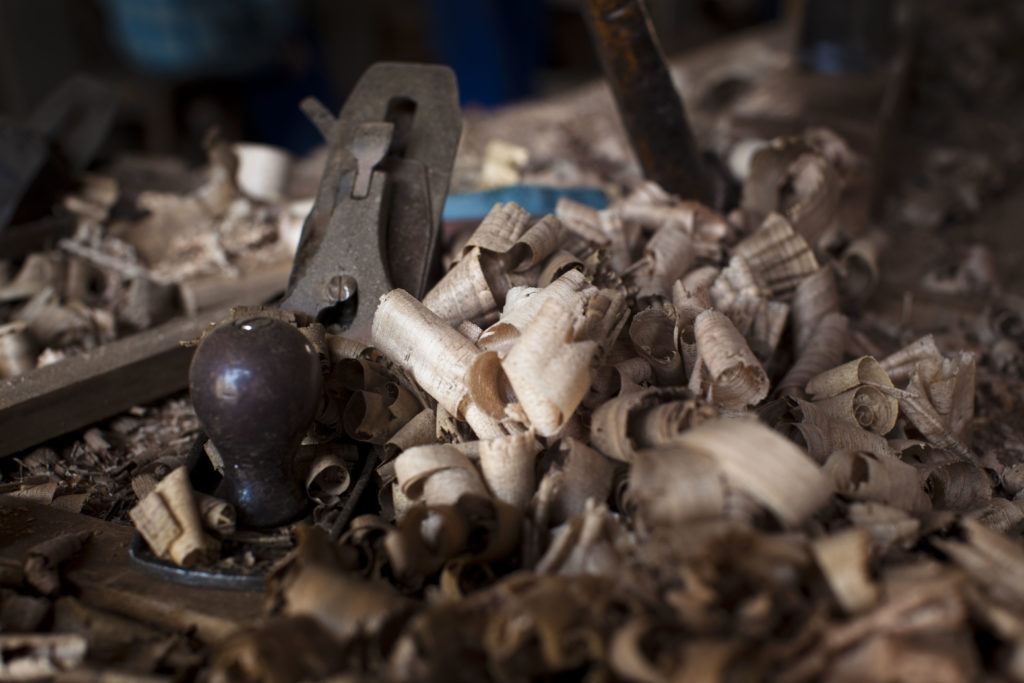 Wood shavings litter the floor of a woodworking shop in Kashmir, India.