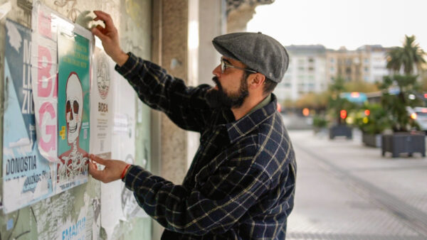 IMB missionary Emilio Marrero, a graphic designer and artist, hangs one of his posters on a busy street. His posters pair provocative images with words that strike at the heart of the culture, urging people to wake up and consider their eternity. IMB Photo