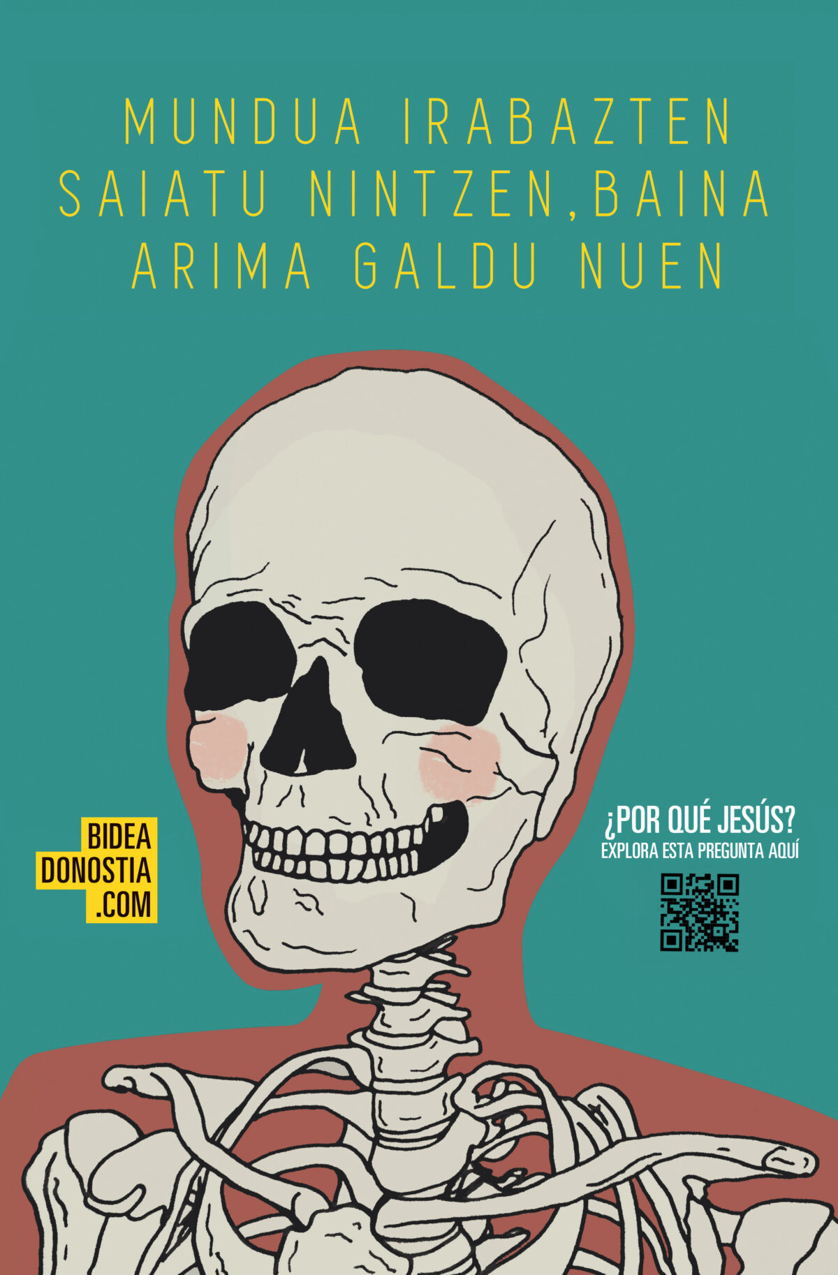This poster, designed by IMB missionary Emilio Marrero, asks, “What good is it to gain the whole world, but lose your soul?” in the Basque language. Emilio said he often finds this poster ripped down because of its provoking message. IMB Graphic