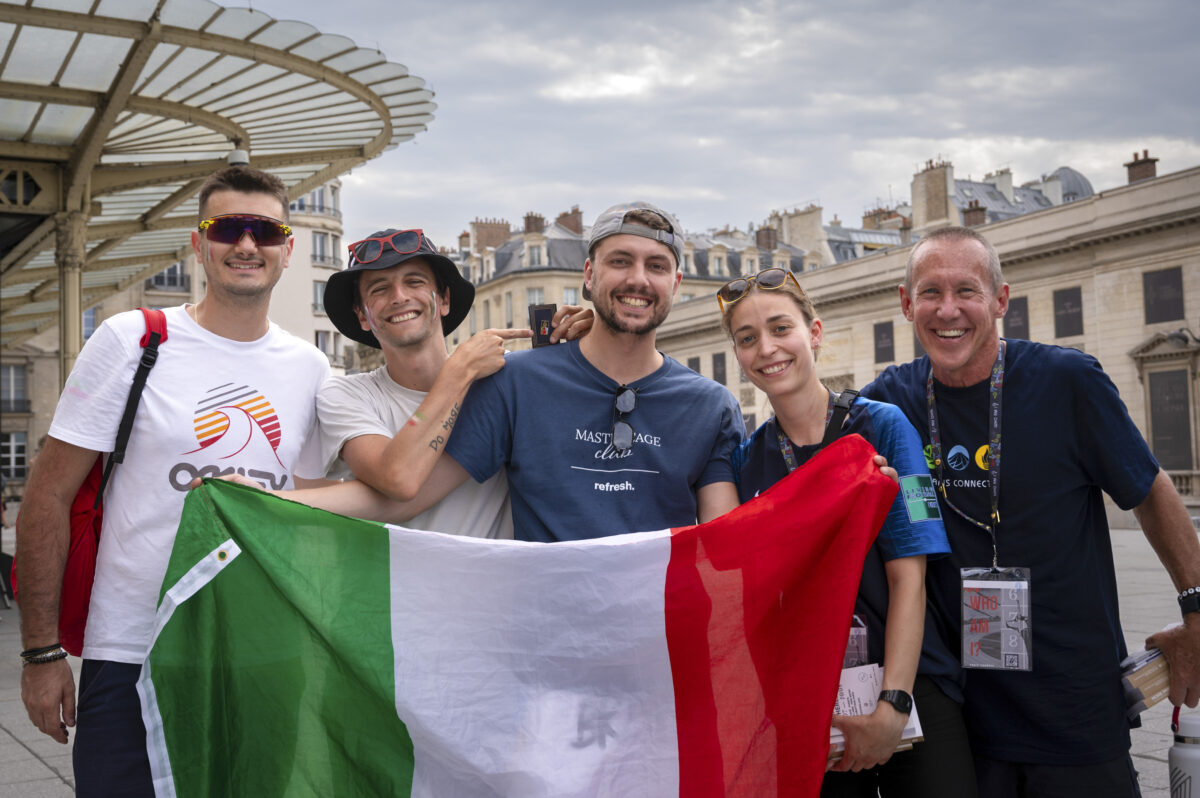 Italian fans are in Paris to cheer for their teams during the Paris Olympics 2024. They pose for camera with two volunteers who are sharing the gospel message during the Olympics.