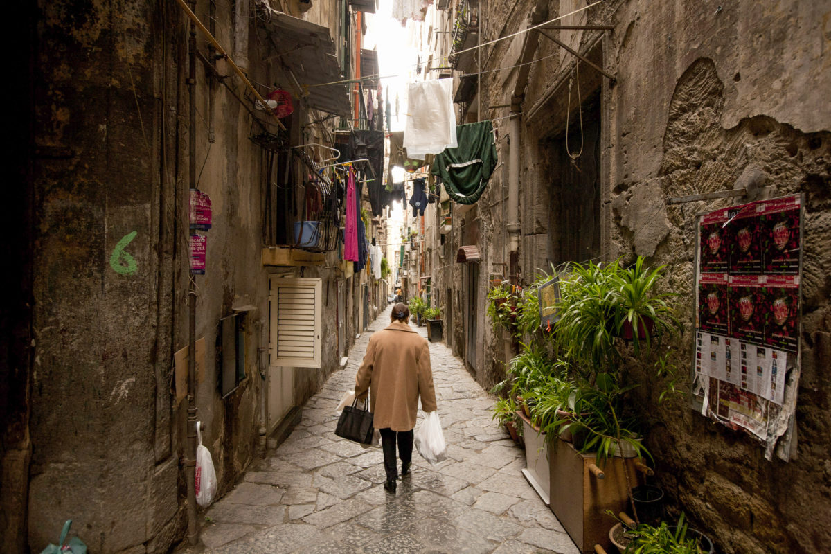 A woman walks down an alleyway in Naples, Italy.