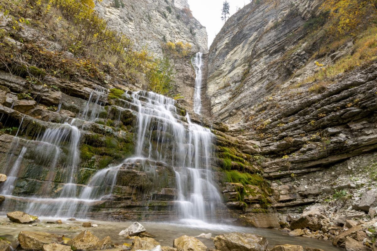 A waterfall in the Caucasus region of Central Asia.