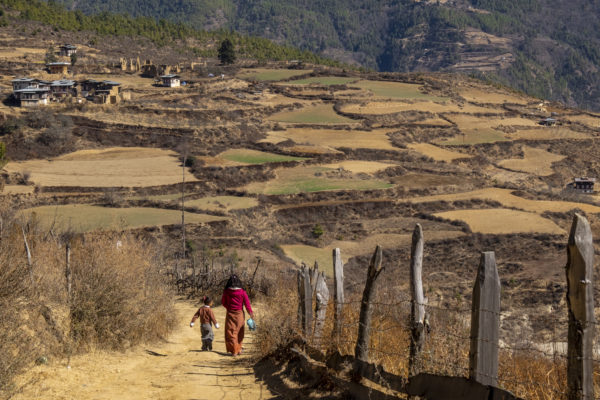 A woman and girl walk down a dirt road in the Kingdom of Bhutan.